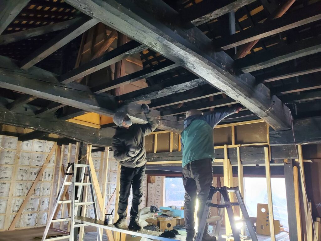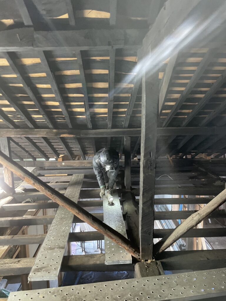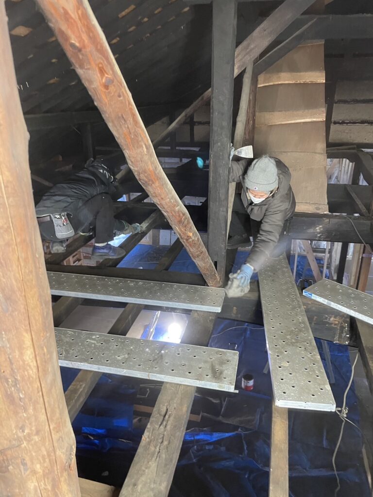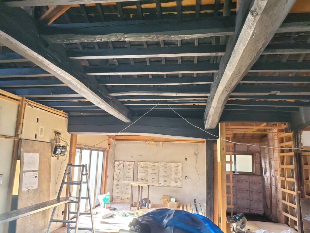 これから天井仕上げに入りますが、梁の上に溜まっている埃がとても多く、ご夫妻にもお手伝いいただきました。