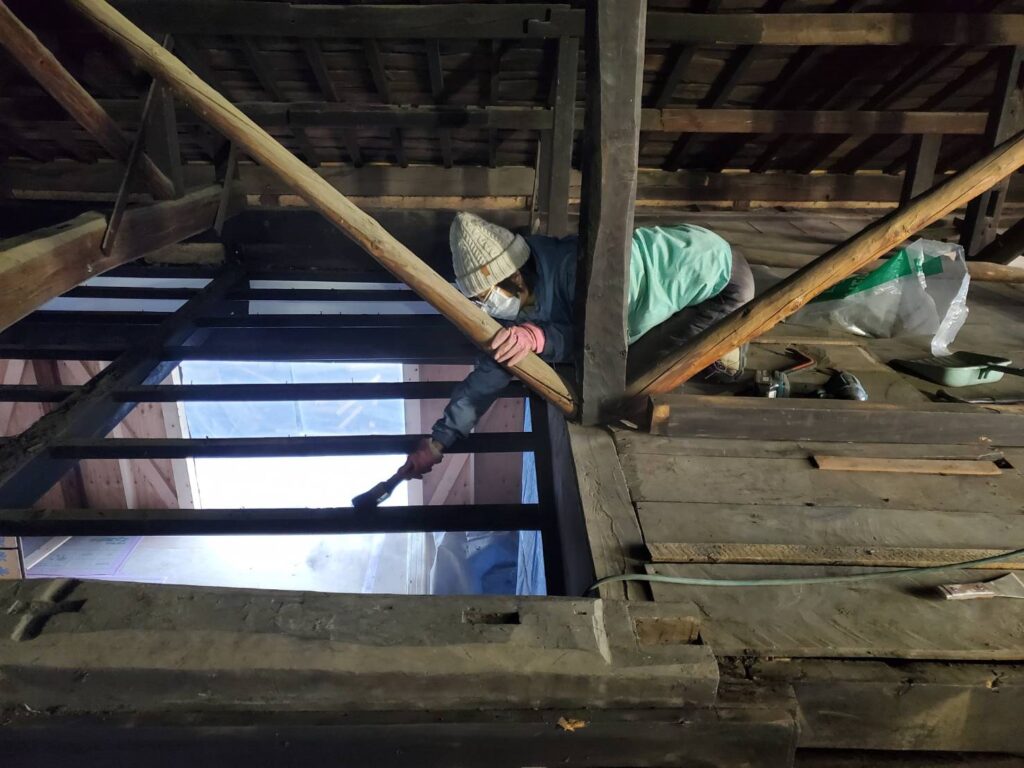 まだ作業は続きます。天井板を張る前に、見えがかりになる梁を先に塗装しておきます。