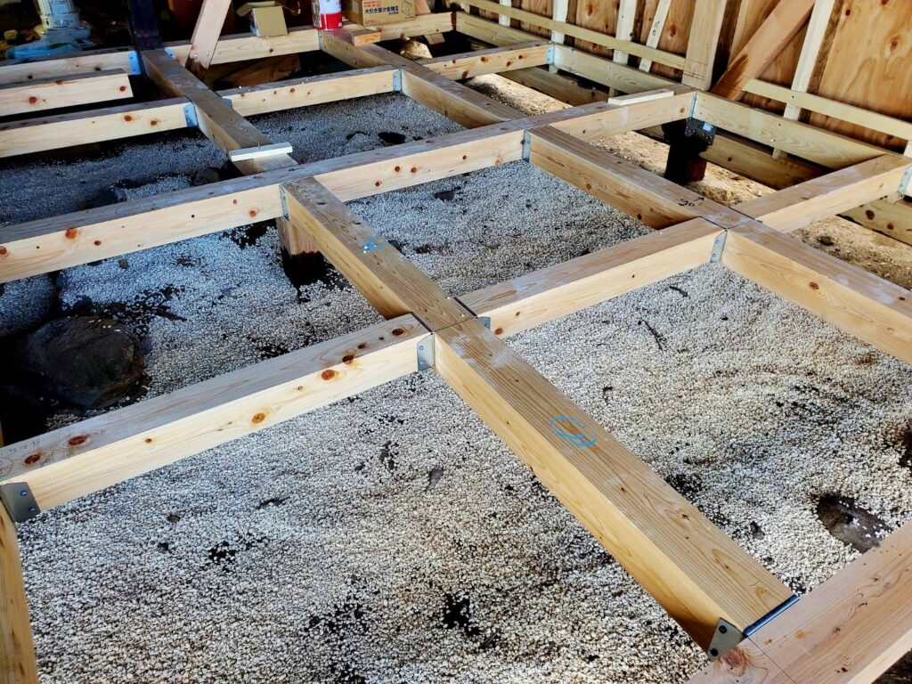 束石が6尺も飛んでいるため通常90角の大引を使用しますが、今回はワンサイズ大きい105角を使用しました。下に見える白いものは防湿剤(100%珪藻土)です。
