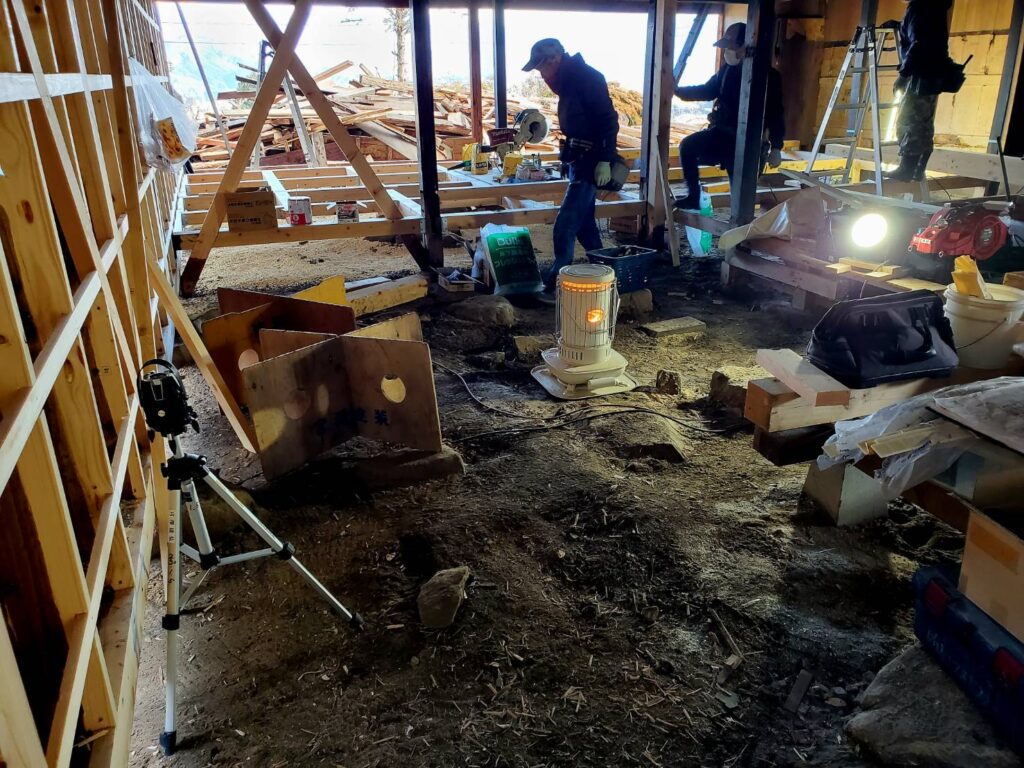 今の現場の様子です。吹きっさらしですがストーブがあるだけで暖かい気持ちになります。