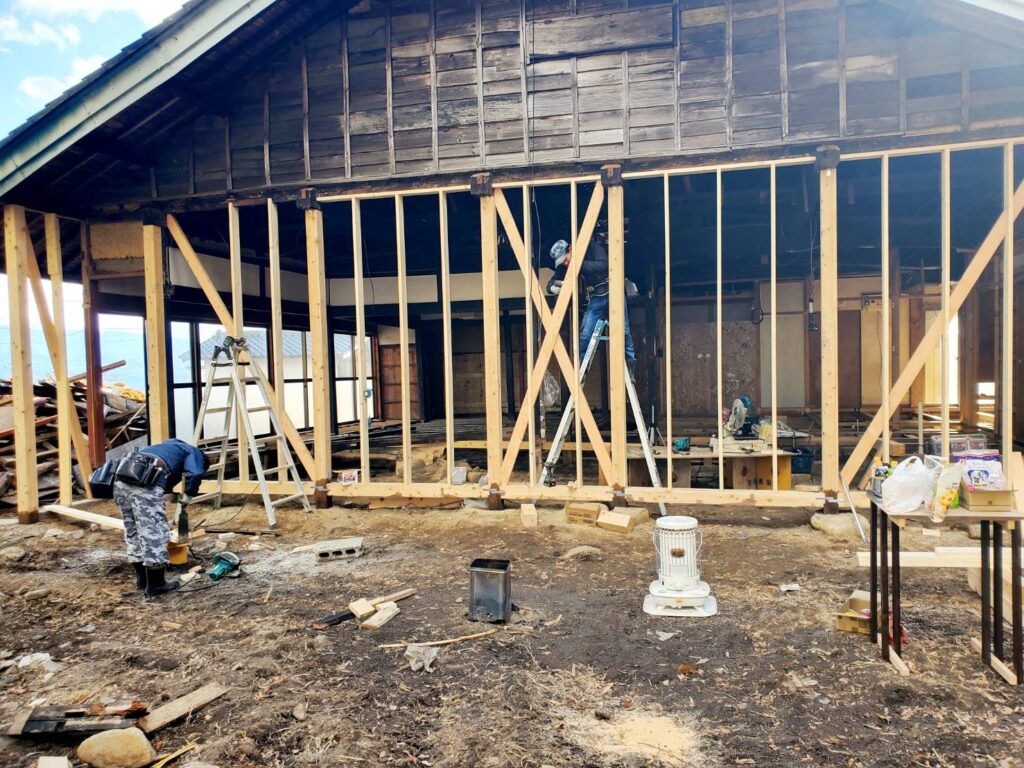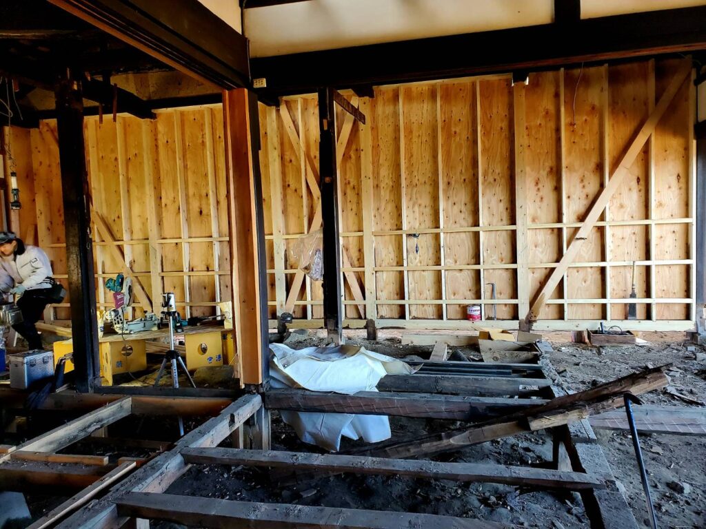 筋交を入れ、耐震ベニヤを張り、通気胴縁を入れました。