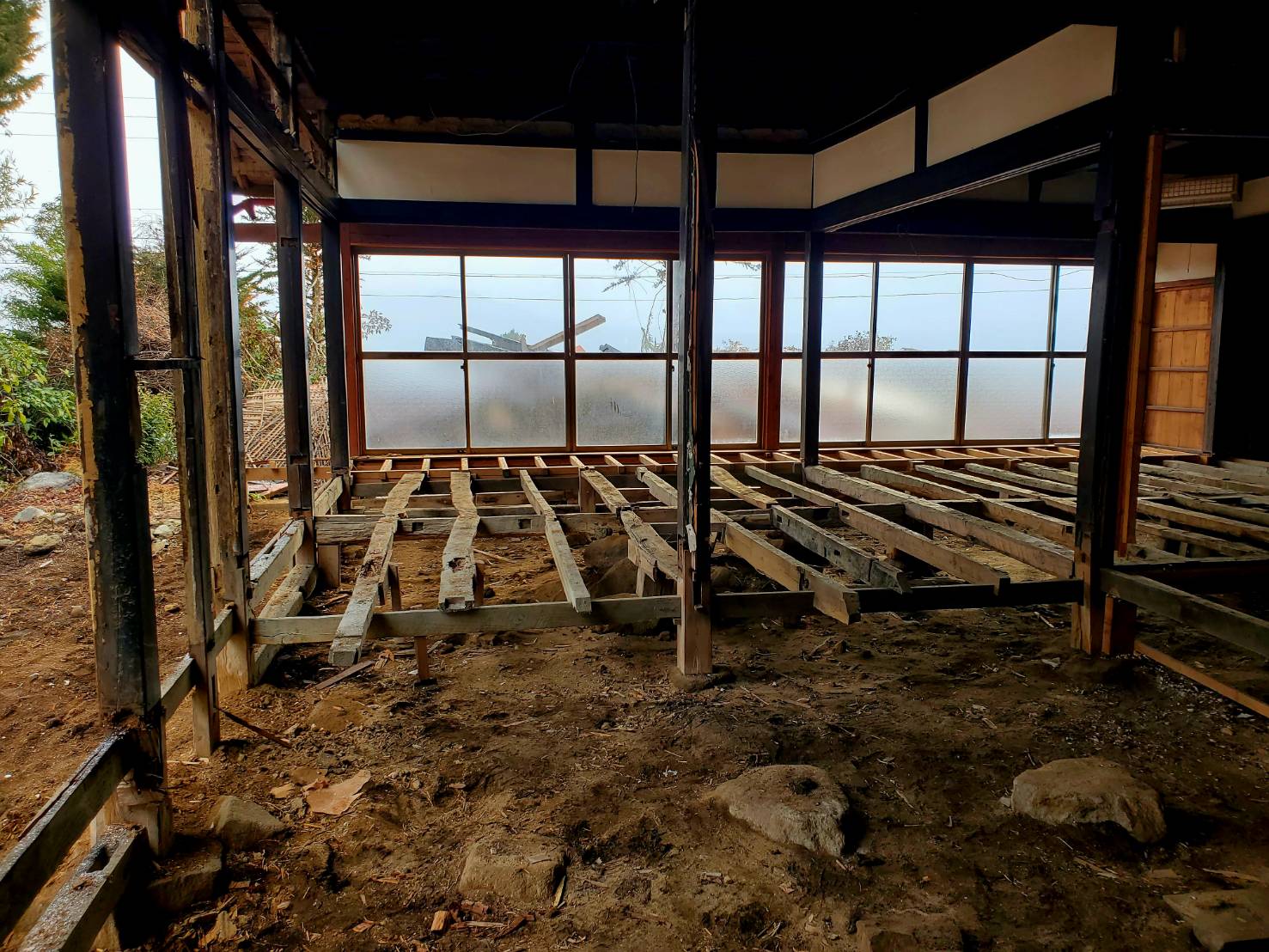 実際に床レベルを測ると、かなり床が斜めになっています。なので結局床はほとんど解体しました。