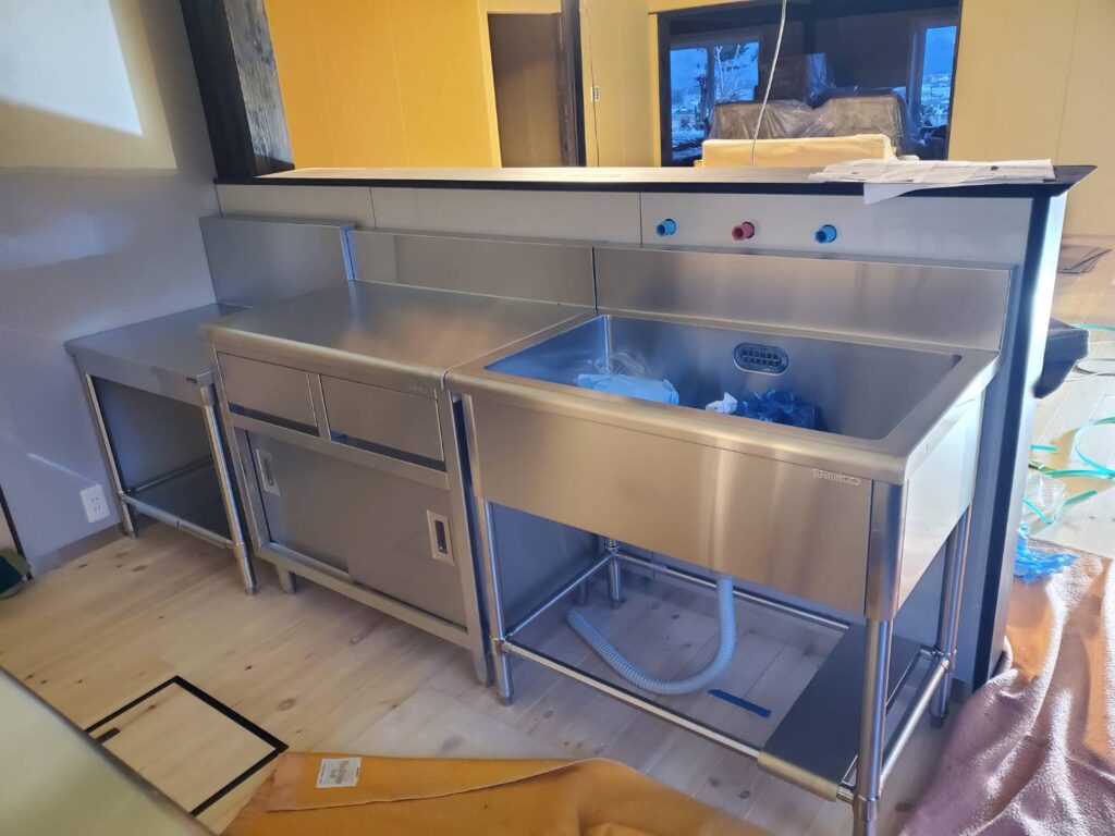 キッチンも出来てきました。予算が限られているため、業務用キッチンを採用しています。