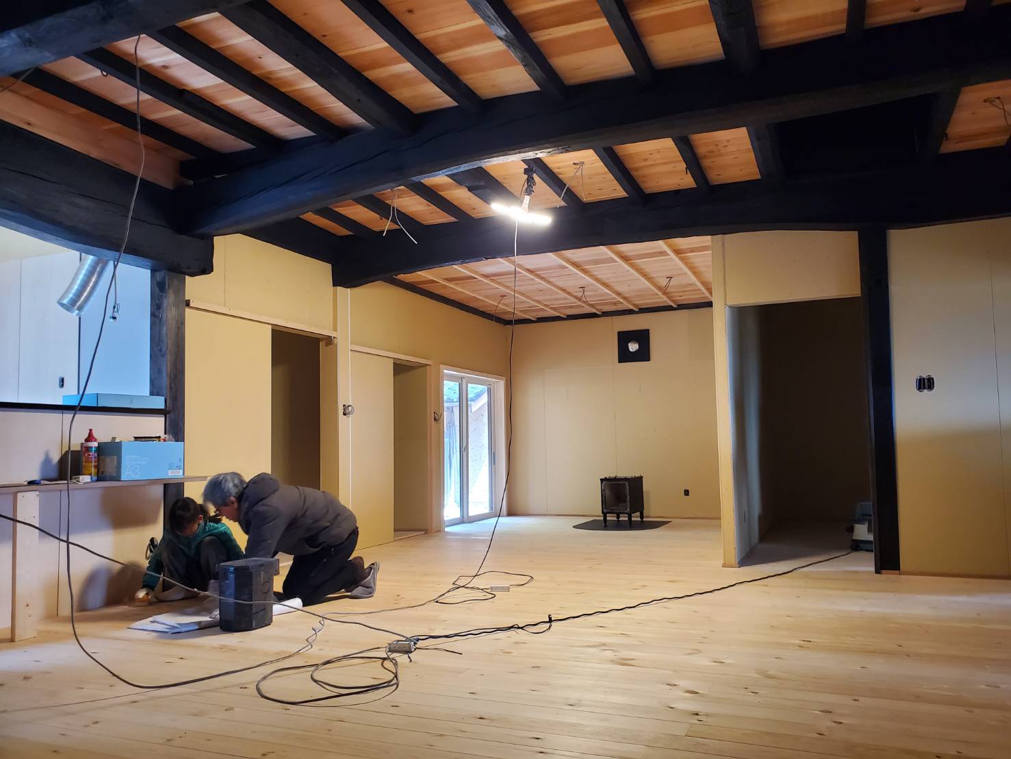 壁はシナベニヤを貼りました。どこかにインパクトのある物体を入れたかったからです。